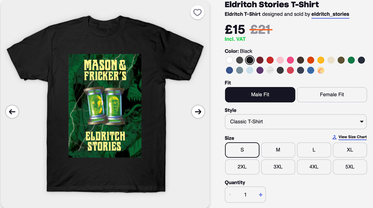 Impress your friends with an Eldritch Stories shirt! Thanks to John Ossoway for the wonderful design.